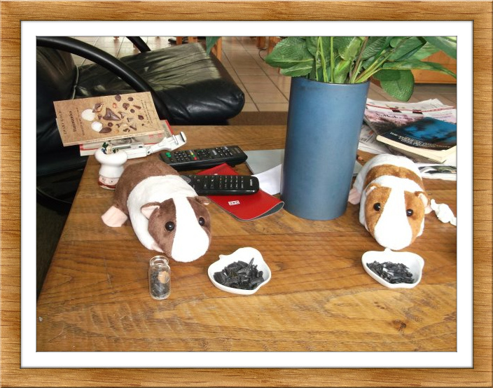 |  | Trotse cavia's tonen hun vondsten. De mannelijke, links, heeft behalve een schoteltje haaientanden ook nog een glazen potje kunnen vullen. De vrouwelijke heeft alleen maar een schoteltje. |