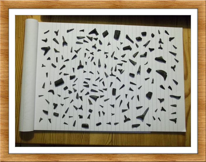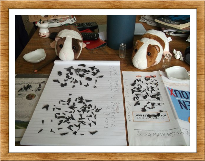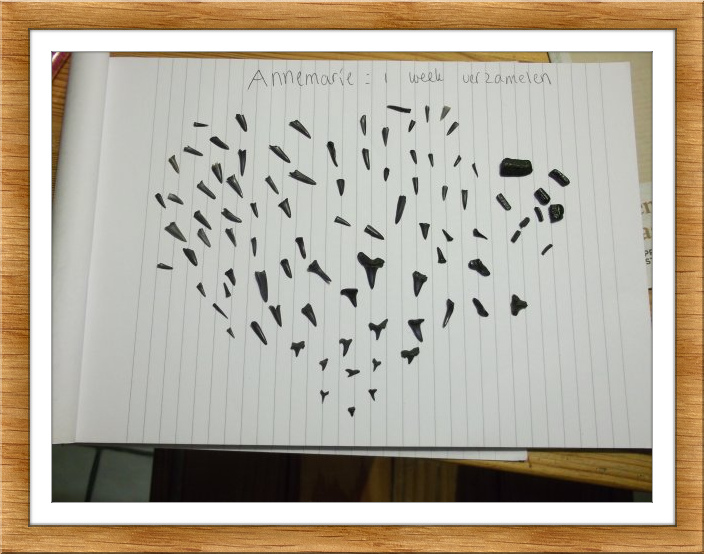 |  | Op donderdag, de dag voor ons vertrek, vonden we meer haaientanden dan in de 6 dagen ervoor bij elkaar, maar wel relatief veel lelijke. |